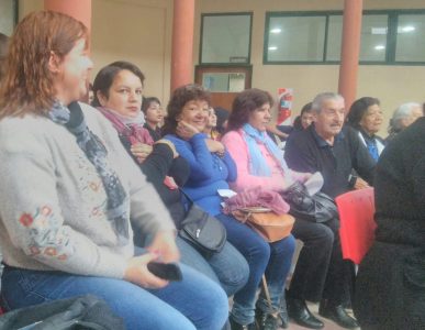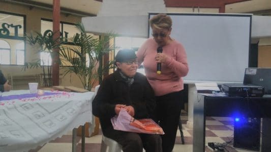 Aideé Aranda, concurrente del Centro de Día para adultos mayores y participante del taller literario, leyó un poema que escribió dedicado al Padre Mario. En la foto, la acompaña la escritora Elisa Strinatti, quien dicta el taller literario en la OPM.