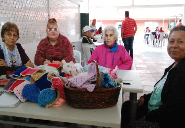 Todos los sábados, muy cerca de la estatua del Padre Mario, un grupo de personas coordinadas por la profesora María Rosa Muñoz se reúnen a tejer mantas y juguetes para abrigar a los niños más necesitados.