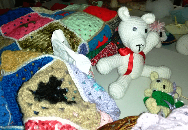 Coordinadas por María Rosa Muñoz, tejen adornos y muñecos pero, fundamentalmente, mantas para abrigar niños.